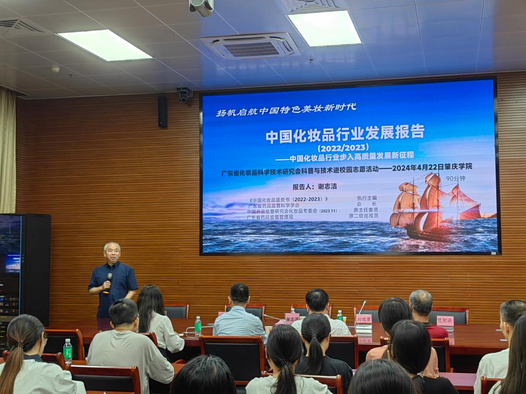 谢志洁重点介绍了伴随着中国经济的发展和人民生活水平的提高,中国化妆品行业迎来了难得的历史机遇。讲座深入剖析中国化妆品行业的发展现状、趋势与挑战,全面展示行业规模、技术创新、市场竞争等方面的成果,同时探讨行业未来发展方向,激发了师生对化妆品科技领域的热情和兴趣。“化妆品”不仅仅是提升自信的工具,更是推动了中国特色化妆品产业高质量发展。