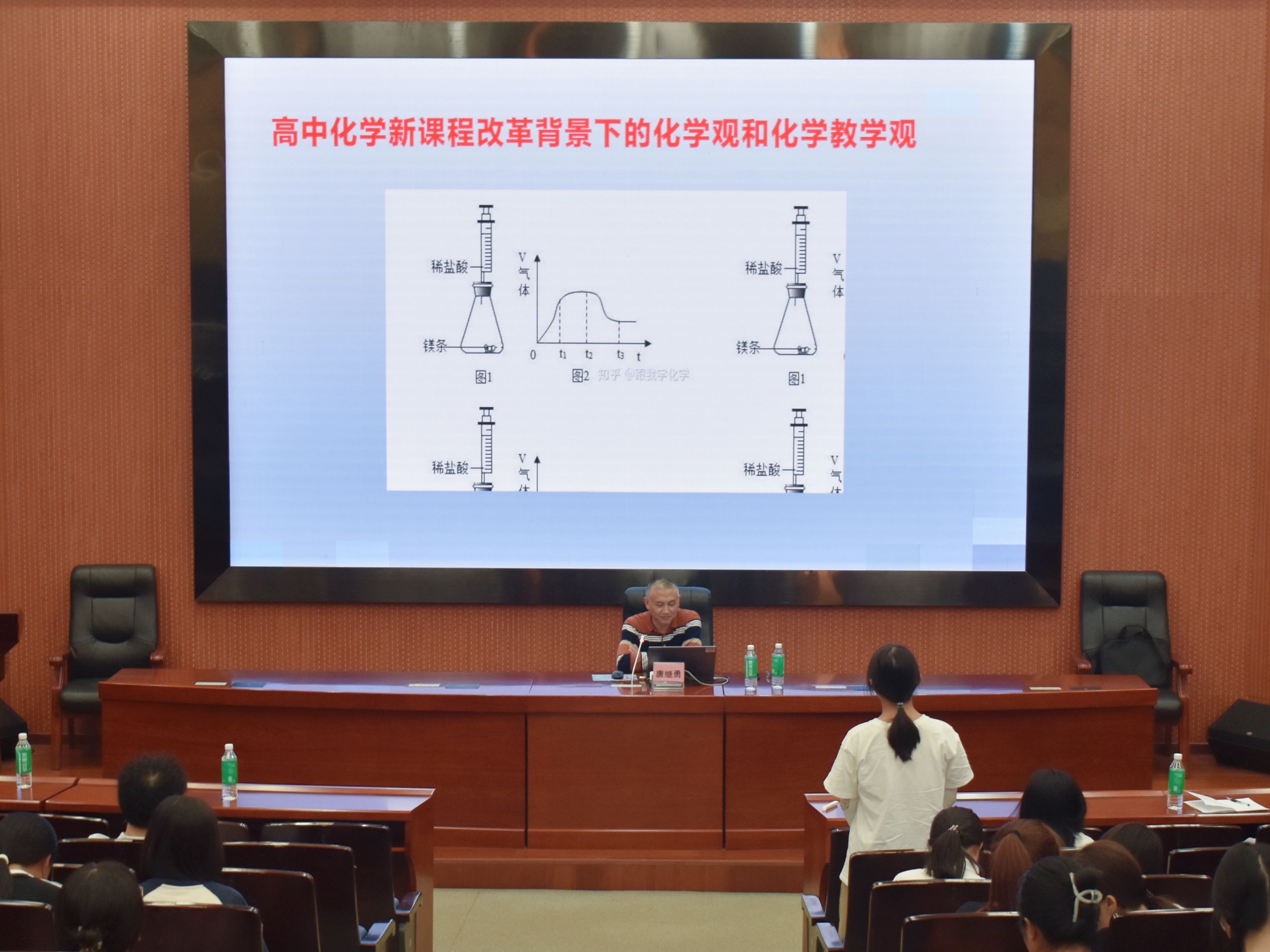 唐继勇老师首先介绍了新课程改革的背景和主要内容,再解释了化学观的内涵和外延,指出化学观是我们人生观和世界观的重要组成部分,接着从物质的多样性与分类、物质的组成与结构、化学变化与规律 、守恒思想和化学的价值观与责任四个方面展现何为化学观念,然后从课堂教学理念的更新、课堂教学方法的创新以及课堂教学评价与反馈讲解新背景下的化学教学观,最后唐老师还补充了在理论高度、学科深度、实践温度这三个方面来指导“如何上好一堂课”。