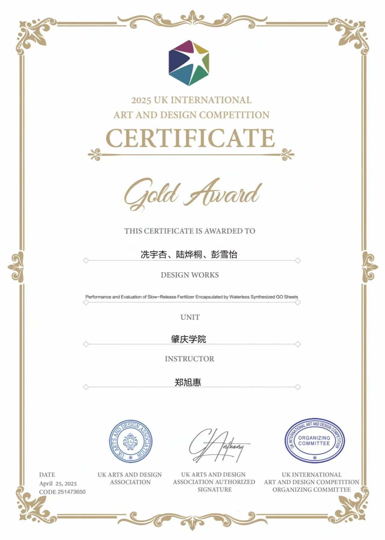 由taptap点点体育,taptap点点官网入口学生冼宇杏、陆烨桐、彭雪怡参与的论文类项目《Performance and Evaluation of Slow-Release Fertilizer Encapsulated by Waterless Synthesized GO Sheets》荣获金奖,由彭雪怡、陆烨桐参与的数字媒体类项目《手护绿美》荣获铜奖,由梁菊、邹海超、陆烨桐、彭雪怡参与的数字媒体类项目《ezGreen碳智汇操作演示视频》荣获优秀奖。
