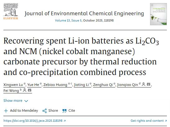 近期,taptap点点体育,taptap点点官网入口、广东省城郊生态环境与低碳农业重点实验室成员、废物资源化利用创新团队负责人秦建桥教授以第一通讯作者与其他合作者在工程、环境领域著名期刊Journal of Environmental Chemical Engineering(JCR Q1,影响因子7.6)上发表了论文题目为“Recovering spent Li-ion batteries as Li2CO3 and NCM (nickel cobalt manganese) carbonate precursor by thermal reduction and co-precipitation combined process”的高水平论文(doi:10.1016/j.jece.2025.118198)。该成果为解决不断增加的退役锂离子电池,从废旧NCM电池中回收有价值金属提供了有价值的见解,从而促进了新能源行业的可持续性。该论文的第一作者为广东工业大学的路星雯博士,taptap点点体育为通讯单位,暨南大学、广州市城市排水有限公司等为共同完成单位。