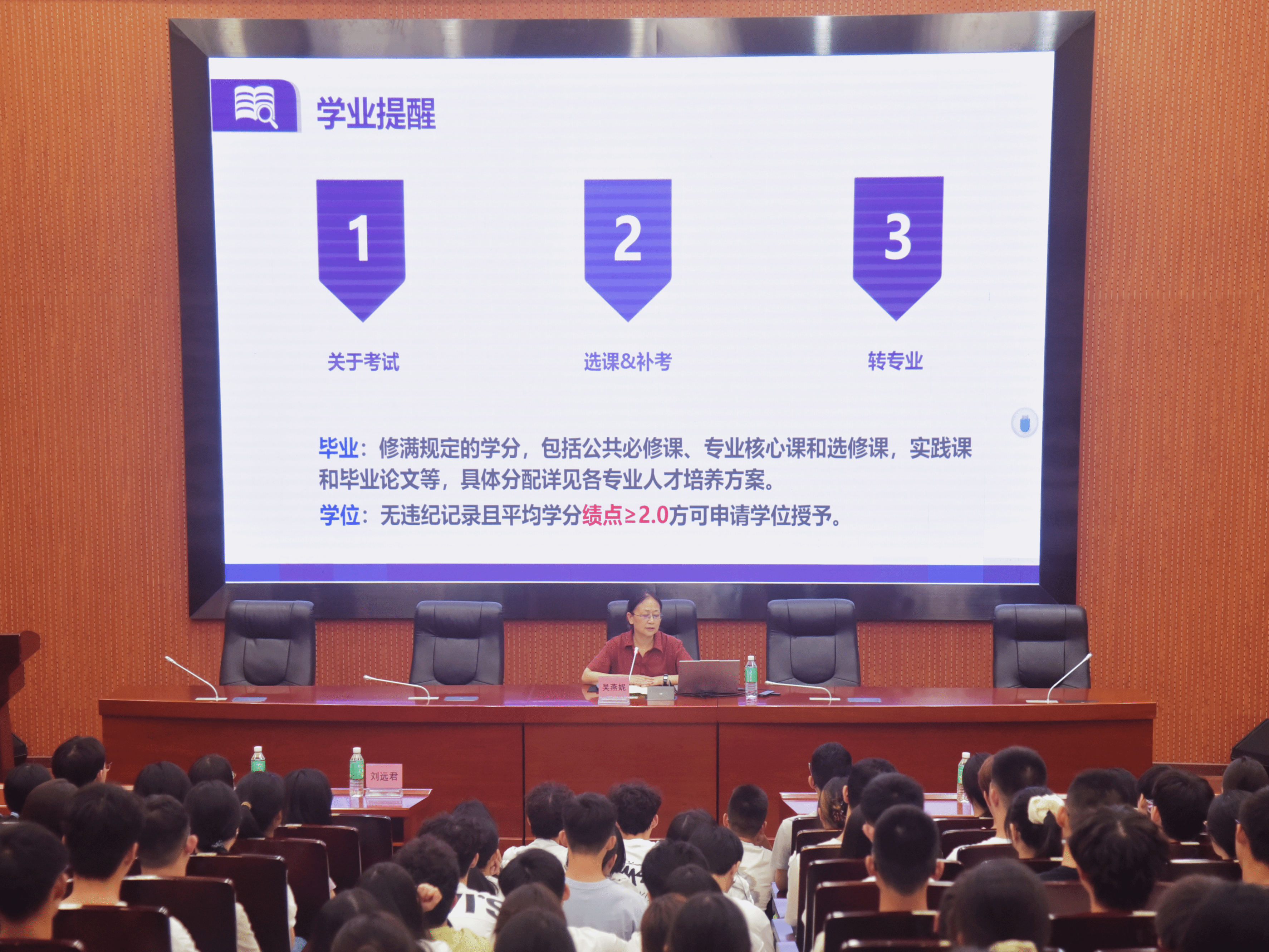 “追风赶月莫停留,平芜尽处是春山。”9月8日晚,吴燕妮副院长带来“启航新征程——2025级新生学习规划与成长指南”分享,为新生勾勒大学成长蓝图。现场,吴院长介绍学院各系及专业分类,又详解考试、课程、毕业、转专业等学业关键事项。最后,吴院长还送上“智者不惑,仁者不忧,勇者不惧”的寄语,屏幕上“预祝大家前程似锦、一路生花”的祝福格外暖心。愿新生们以此次教育为发轫之基,于大学殿堂中奋楫扬帆、追光逐梦,在青春的赛道上书写属于自己的华彩篇章。