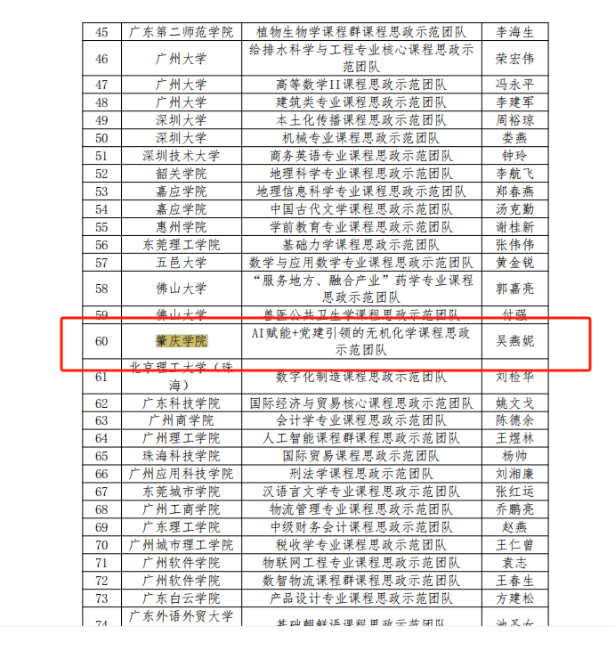 近日,广东省教育厅公布了2024年度本科高校课程思政改革示范项目认定名单,taptap点点体育吴燕妮教授带领的“AI赋能+党建引领的无机化学课程思政示范团队”在课程思政示范团队项目申报中脱颖而出,成功立项。