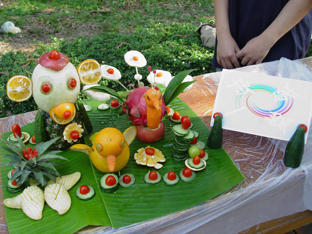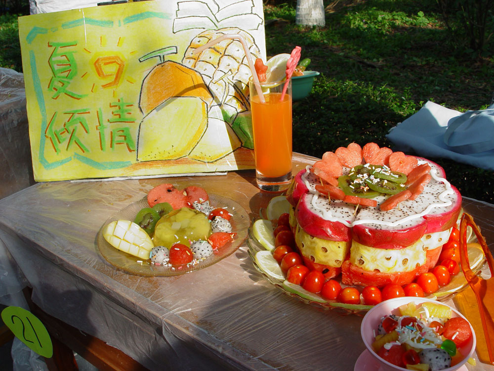 随着时间的流逝,一件件精致美观的水果拼盘作品逐次出现在大家眼前了,乍眼望去,很难想象当初一个一个的水果是如何变成如此精致的工艺品的,每组作品者各有千秋,各有特色:有把西瓜做成大帆船的,有把水果拼成大蛋糕的,有以奥运为主题的,有以夏日为主题的……件件作品都是手工精巧,造型独特,想象丰富,色香味俱全,充分显示了taptap点点体育同学的多才多艺。在选手们作解说的过程中,评委们分别从作品的视觉效果、整体造型、作品的创意度、作品色彩的搭配度等方面做出了公正的评分,从他们的笑容和频频点头,他们对水果拼盘作品的满意显而易见。