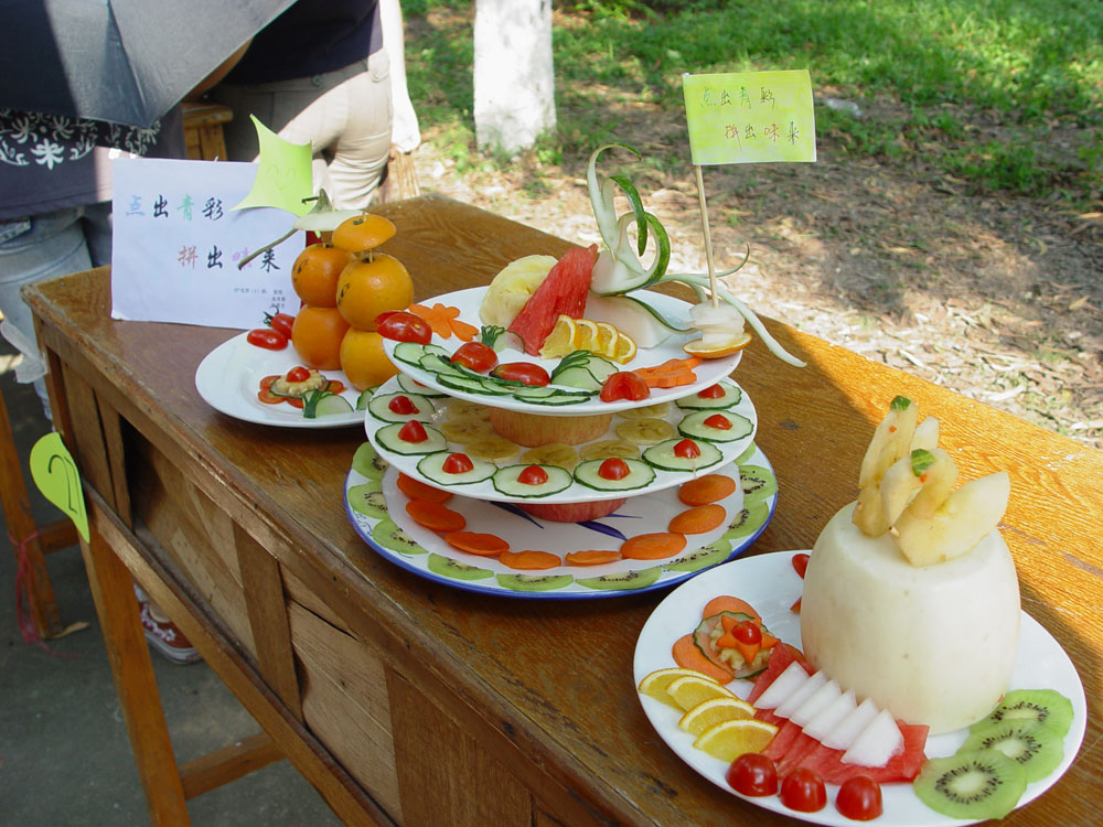 比赛当天,气氛热闹精彩,果香四溢。阳光灿烂,同学们的热情就像这太阳一样,兴致黯然。在为参赛者准备的每张桌子上,都整齐地摆放着他们这次比赛所需的各种水果和盘子碟子,可见他们在比赛之前从选料到设计就经过了周全的思考和商量。只见选手们纷纷跃跃欲试,准备一展手艺,主持人一宣布比赛开始,选手们便迫不及待地分工合作,朝他们心目中水果拼盘的形状努力了。顿时,西瓜的甜,青瓜的爽,菠萝的蜜,苹果的纯……溢满整个场地。作为评委的领导和老师以及其他学院的学生干部也被选手们的心灵手巧吸引了,一边观看选手们的制作细节,一边点头称是,观众们更是为他们喜欢的水果拼盘作品流连忘返、加油打气。参赛组和观众虽多,但是他们都非常遵守有关规则,所以整场比赛都是井井有条地进行。选手们在比赛规定的范围内,尽情地发挥想象力,在欢笑声和分工合作中为自己的作品努力,充分发挥我们学院团结互助、严于守纪的优良作风。