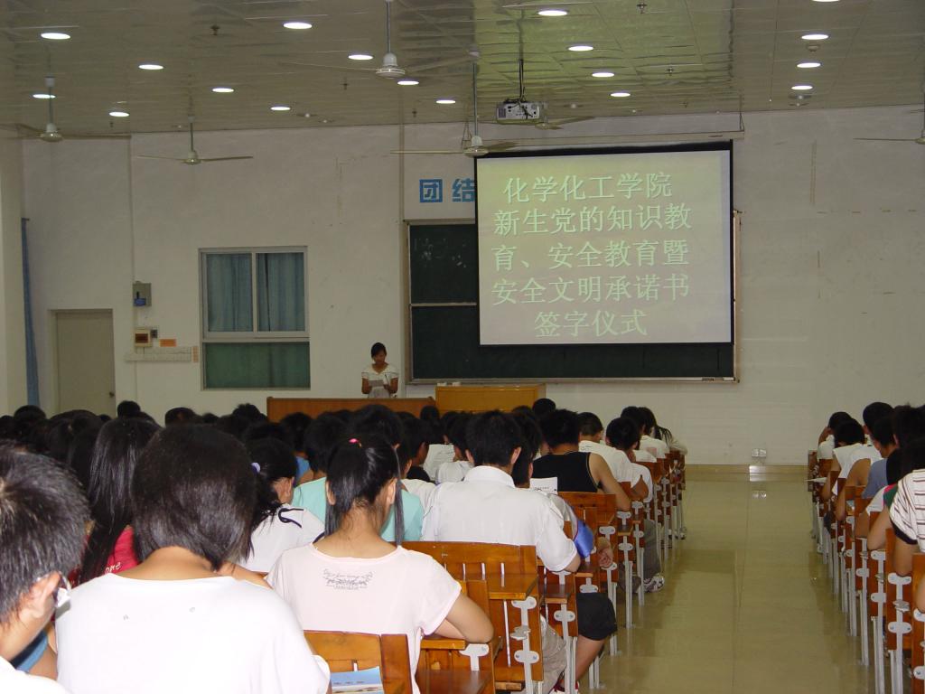 9月12日晚,化学化工学院开展了新生党的知识教育、安全教育暨安全文明承诺书签字仪式。在辅导员胥家桢老师主持下,08届新生在文明承诺书上签下了自己的名字,并由郑少丽师姐将文明承诺书递交给学生处的卢咏科长。之后由陈玉华老师分别给新生们讲解了大学生适应教育以及党的知识教育,包括党史及如何入党等内容,同学们都十分认真地倾听,并不时记下老师所讲的内容。最后胥家桢老师为同学们讲解了新生安全教育,用实实在在的事例给同学们敲响警钟,并给同学们提出了许多日常生活中的安全建议。