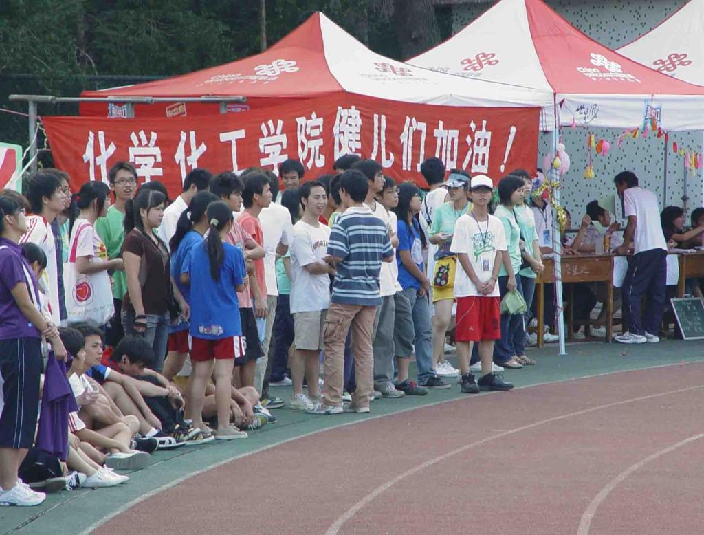 虽然院运会7点30分才正式开始,但不到7点,田径场上已经人声鼎沸了,到处都是各学院和各班工作人员忙碌的身影。田径场上彩旗飘扬,各学院和各班的旗帜、横幅跟海报遍布在运动场四周。