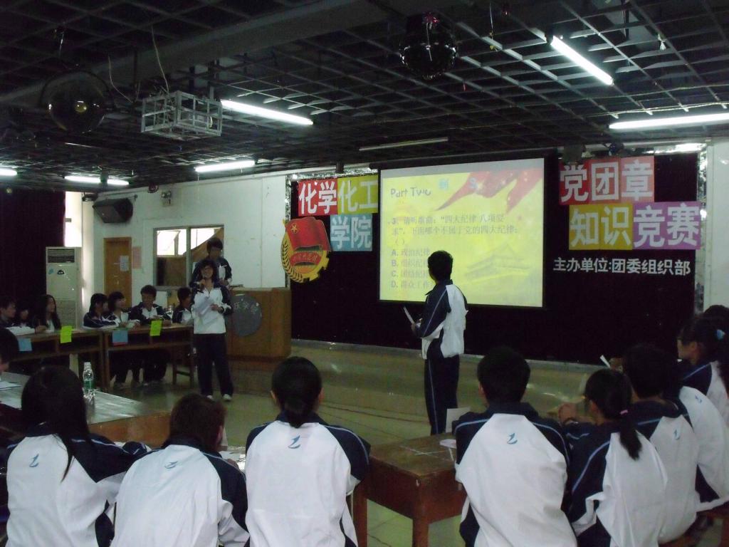 最后,胥家桢老师对本次活动作了点评并倡导大家要明确团员、党员的义务和责任,将党的“三个代表”思想融入自身日常生活中,首先做到为同学服务,进而做到为人民服务。通过本次竞赛,相信09届新生对团、党章皆有了深入的学习和了解,在以后生活中更好地规范自己的行为。