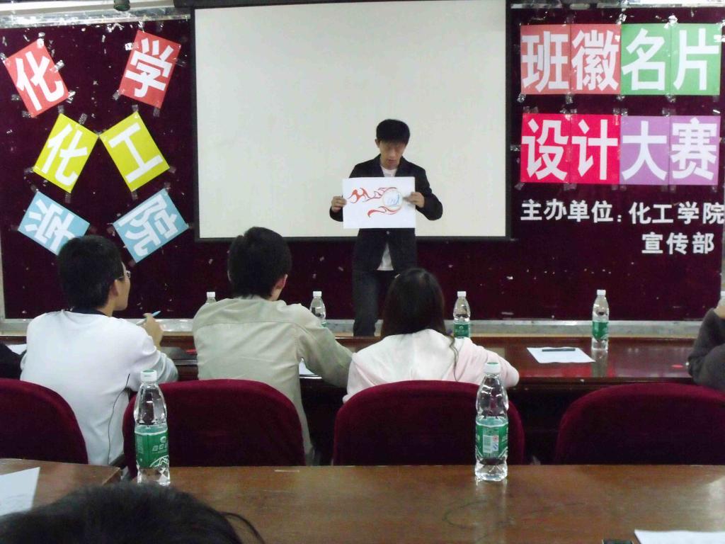 本次比赛流程为:各班代表上台解说班徽设计理念、评委打分同时现场进行观众有奖竞答、曾佳麟对比赛作总结,最后观众给个人设计名片投票。精彩的作品纷纷登场亮相:有14个四叶草组成的代表09精化56名同学团结在一起;有快速滚动前进的火球,寓意07化学班奋发向前冲的顽强斗志;有5个半开心隐藏“制药”二字之间代表5个地区相聚一起、共同生活的08制药等。各班啦啦队纷纷为代表们加油鼓气,不断将比赛气氛推向高潮。而在一旁等待着观众投票的名片,个性张扬,各显特色,展现着名片主人的个性与设计才华。