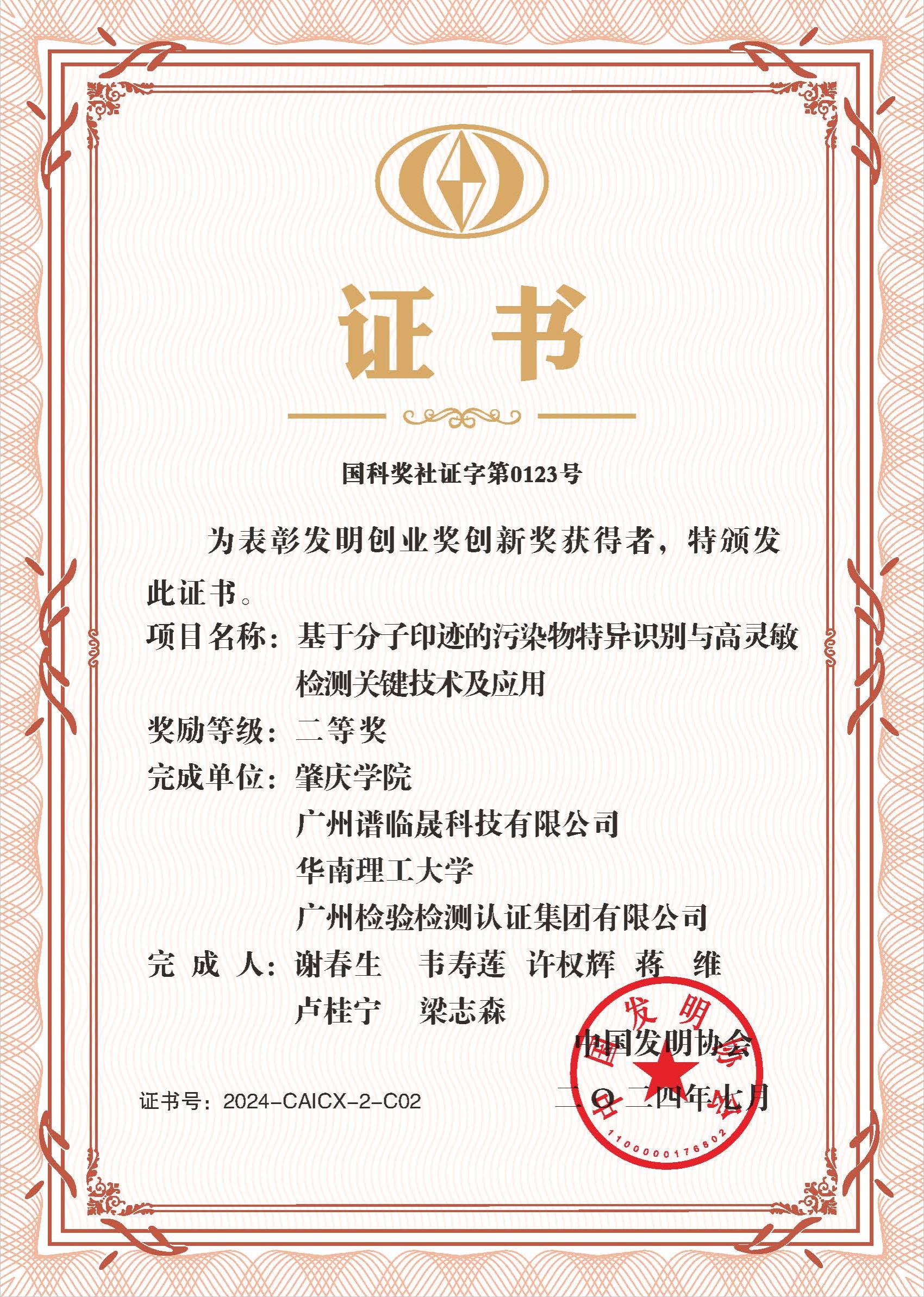 近日,中国发明协会颁发了2024年度发明创业奖证书,taptap点点体育作为第一完成单位、谢春生教授作为第一完成人的“基于分子印迹的污染物特异识别与高灵敏检测关键技术及应用”成果获得发明创业奖创新奖二等奖!